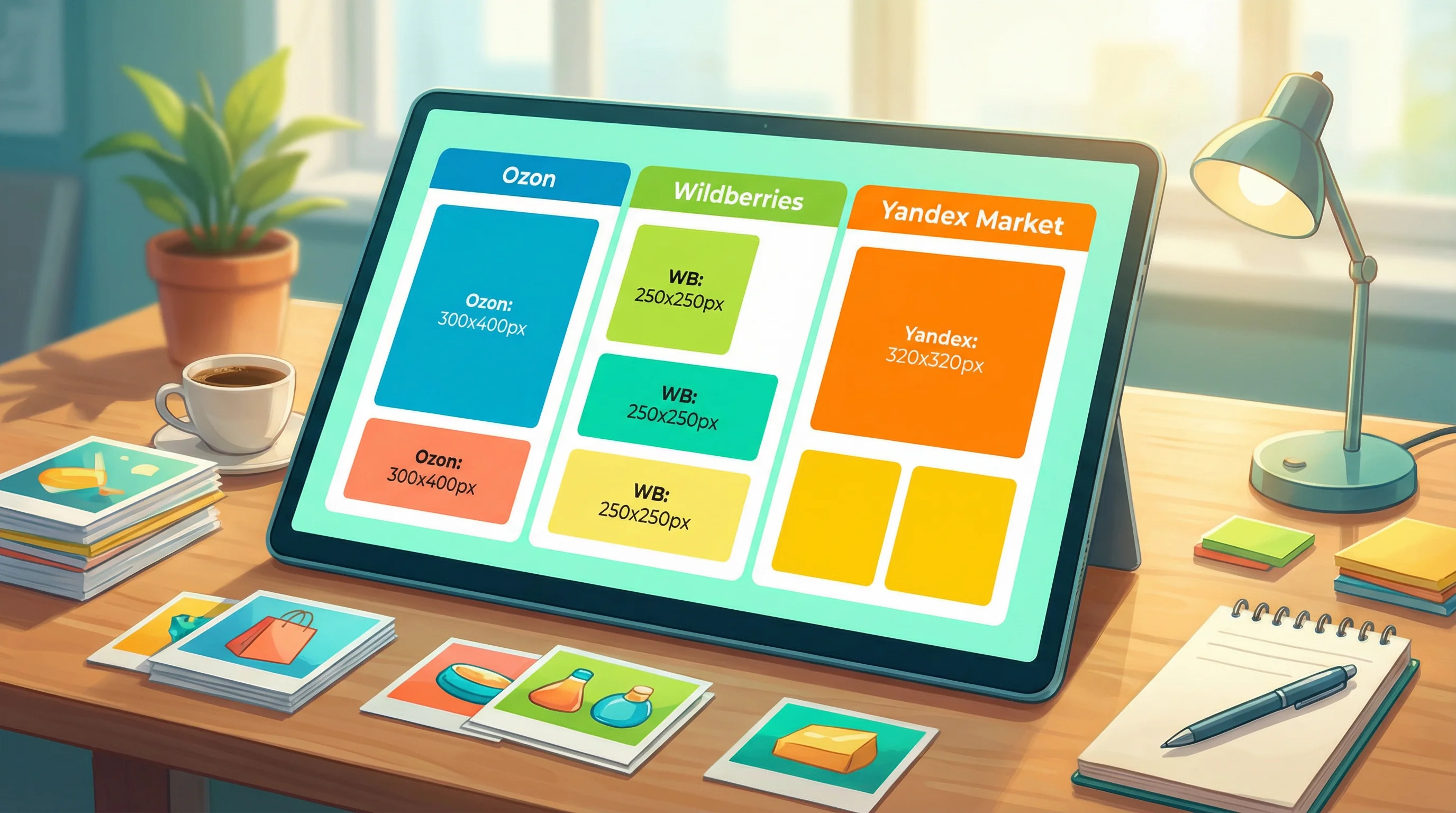 Актуальные размеры фото и инфографики для Ozon, Wildberries и Яндекс Маркет в 2026 году. Полная таблица требований к формату и разрешению.