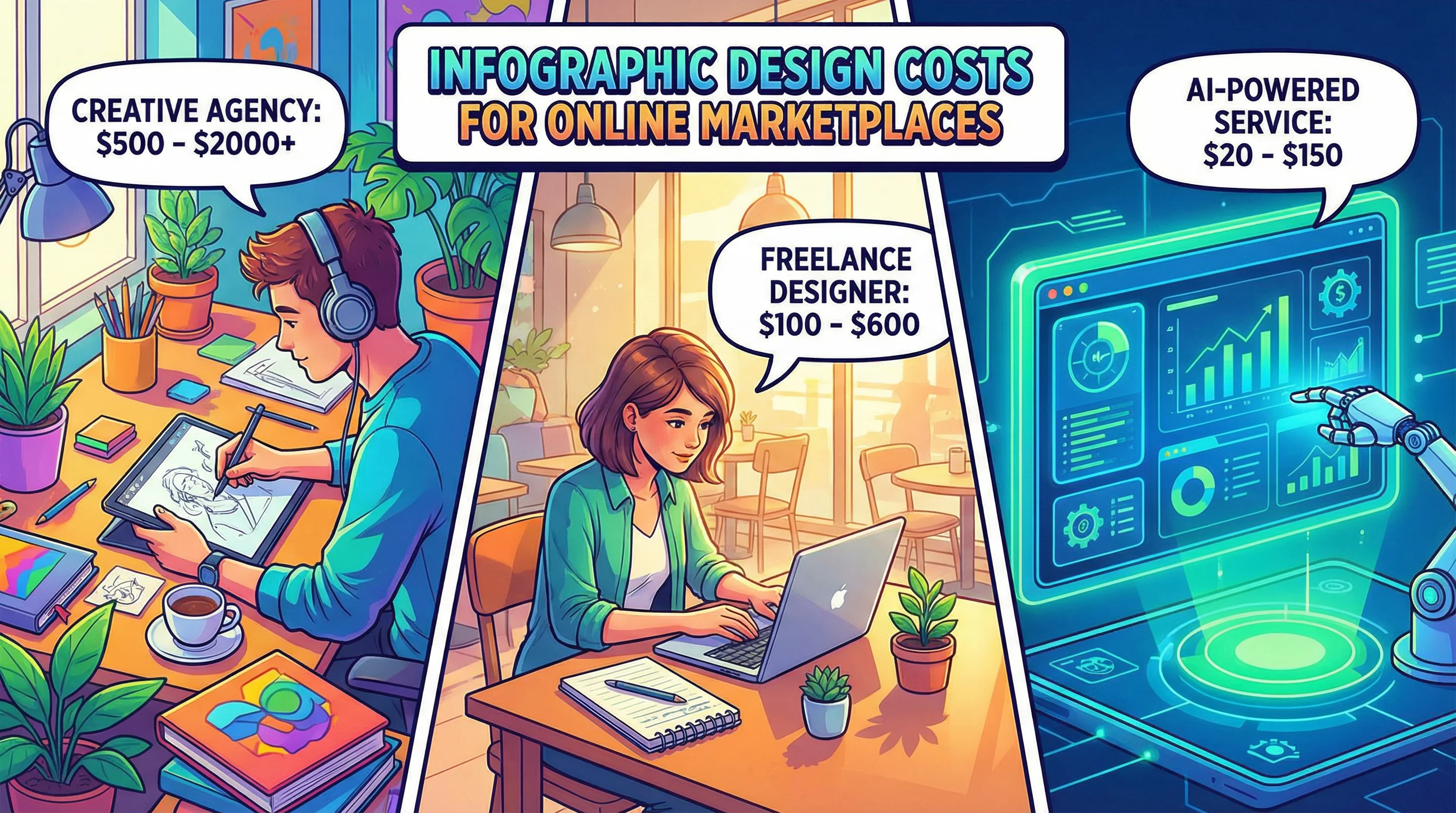 Сколько стоит инфографика для маркетплейса в 2026 году: сравнение цен дизайнеров, фрилансеров, конструкторов и AI-сервисов с расчётом ROI.