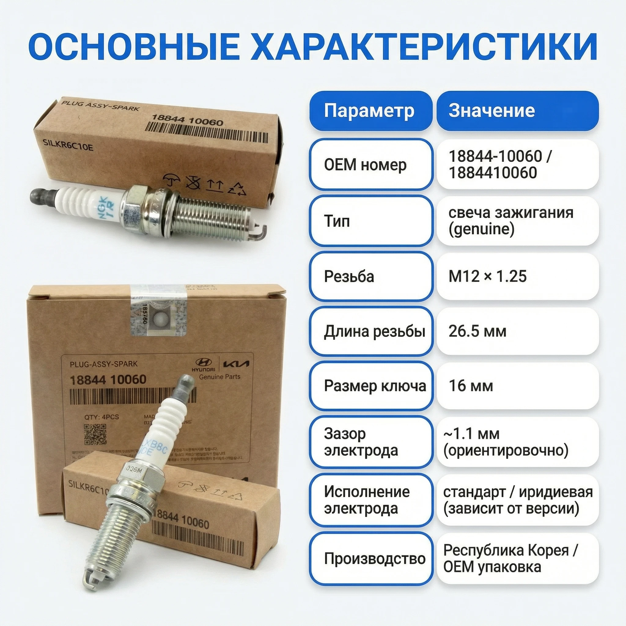 Основные характеристики Параметр Значение OEM номер 18844-10060 / 1884410060 Тип свеча зажигания (genuine) Резьба M12 × 1.25 Длина резьбы 26.5 мм Размер ключа 16 мм Зазор электрода ~1.1 мм (ориентировочно) Исполнение электрода стандарт / иридиевая (зависит от версии) Производство Республика Корея / OEM упаковка