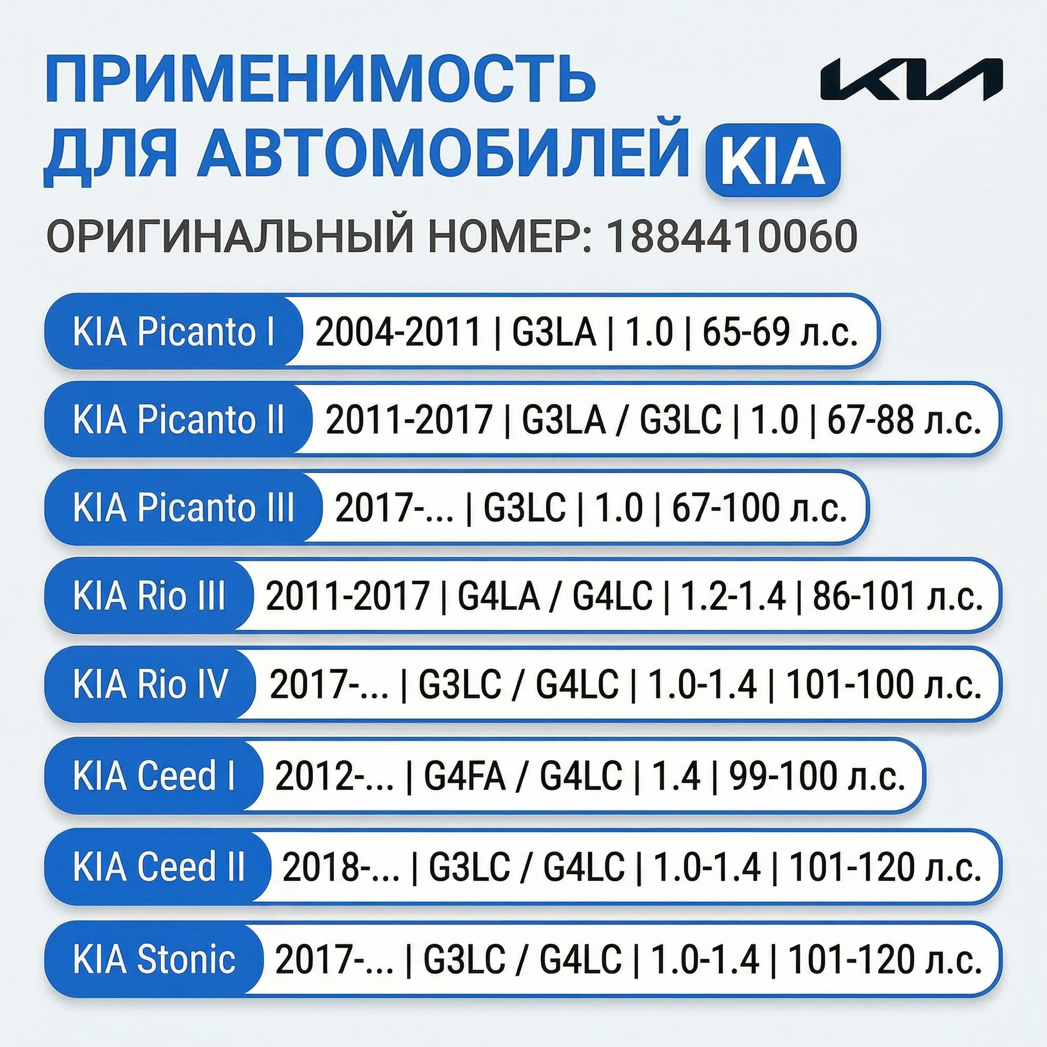 KIA KIA Picanto I | 2004-2011 | G3LA | 1.0 | 65-69 л.с. KIA Picanto II | 2011-2017 | G3LA / G3LC | 1.0 | 67-88 л.с. KIA Picanto III | 2017-… | G3LC | 1.0 | 67-100 л.с. KIA Rio III | 2011-2017 | G4LA / G4LC | 1.2-1.4 | 86-101 л.с. KIA Rio IV | 2017-… | G3LC / G4LC | 1.0-1.4 | 101-100 л.с. KIA Ceed I | 2012-… | G4FA / G4LC | 1.4 | 99-100 л.с. KIA Ceed II | 2018-… | G3LC / G4LC | 1.0-1.4 | 101-120 л.с. KIA Stonic | 2017-… | G3LC / G4LC | 1.0-1.4 | 101-120 л.с.