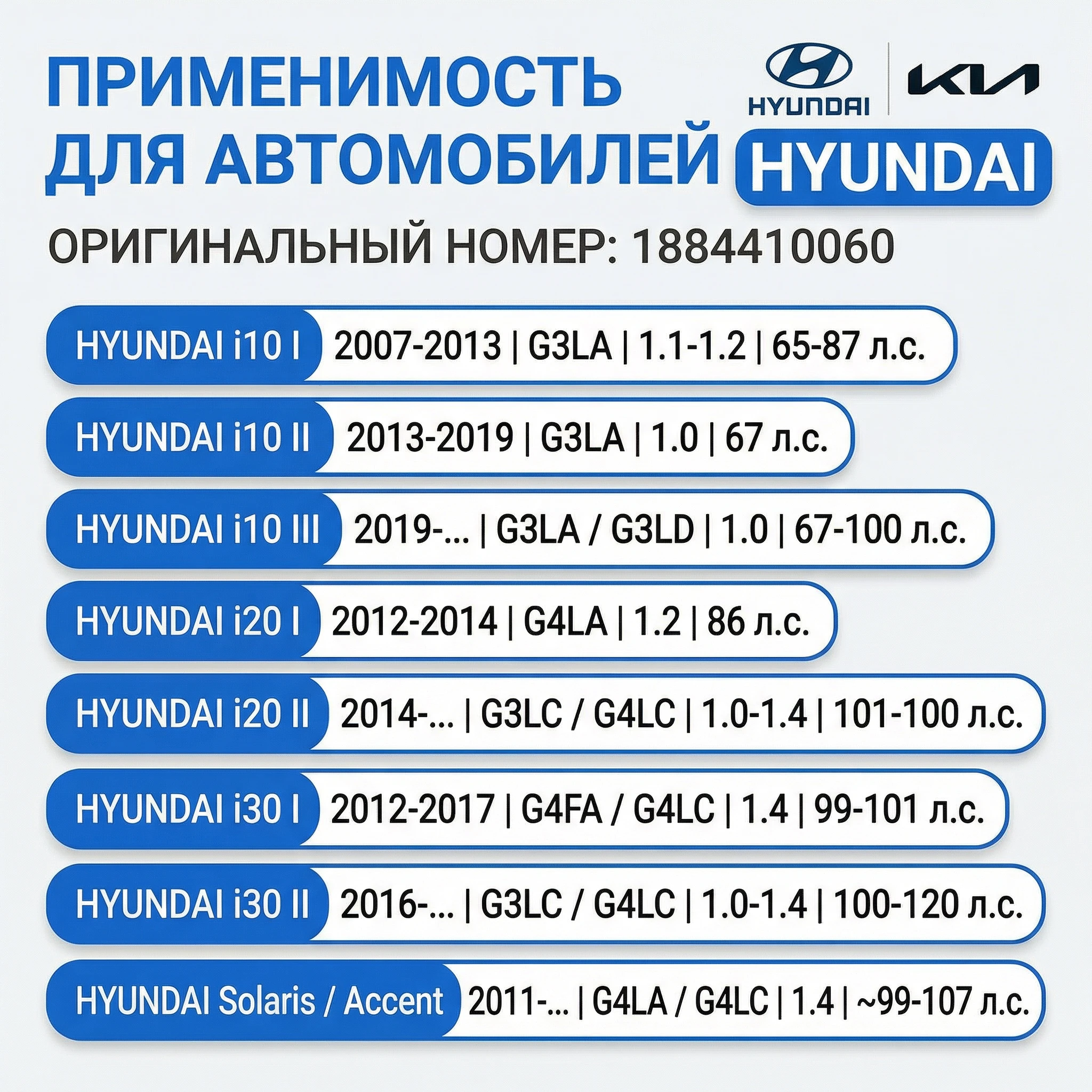применимость для автомобилей HYUNDAI HYUNDAI i10 I | 2007-2013 | G3LA | 1.1-1.2 | 65-87 л.с. HYUNDAI i10 II | 2013-2019 | G3LA | 1.0 | 67 л.с. HYUNDAI i10 III | 2019-… | G3LA / G3LD | 1.0 | 67-100 л.с. HYUNDAI i20 I | 2012-2014 | G4LA | 1.2 | 86 л.с. HYUNDAI i20 II | 2014-… | G3LC / G4LC | 1.0-1.4 | 101-100 л.с. HYUNDAI i30 I | 2012-2017 | G4FA / G4LC | 1.4 | 99-101 л.с. HYUNDAI i30 II | 2016-… | G3LC / G4LC | 1.0-1.4 | 100-120 л.с. HYUNDAI Solaris / Accent | 2011-… | G4LA / G4LC | 1.4 | ~99-107 л.с.
