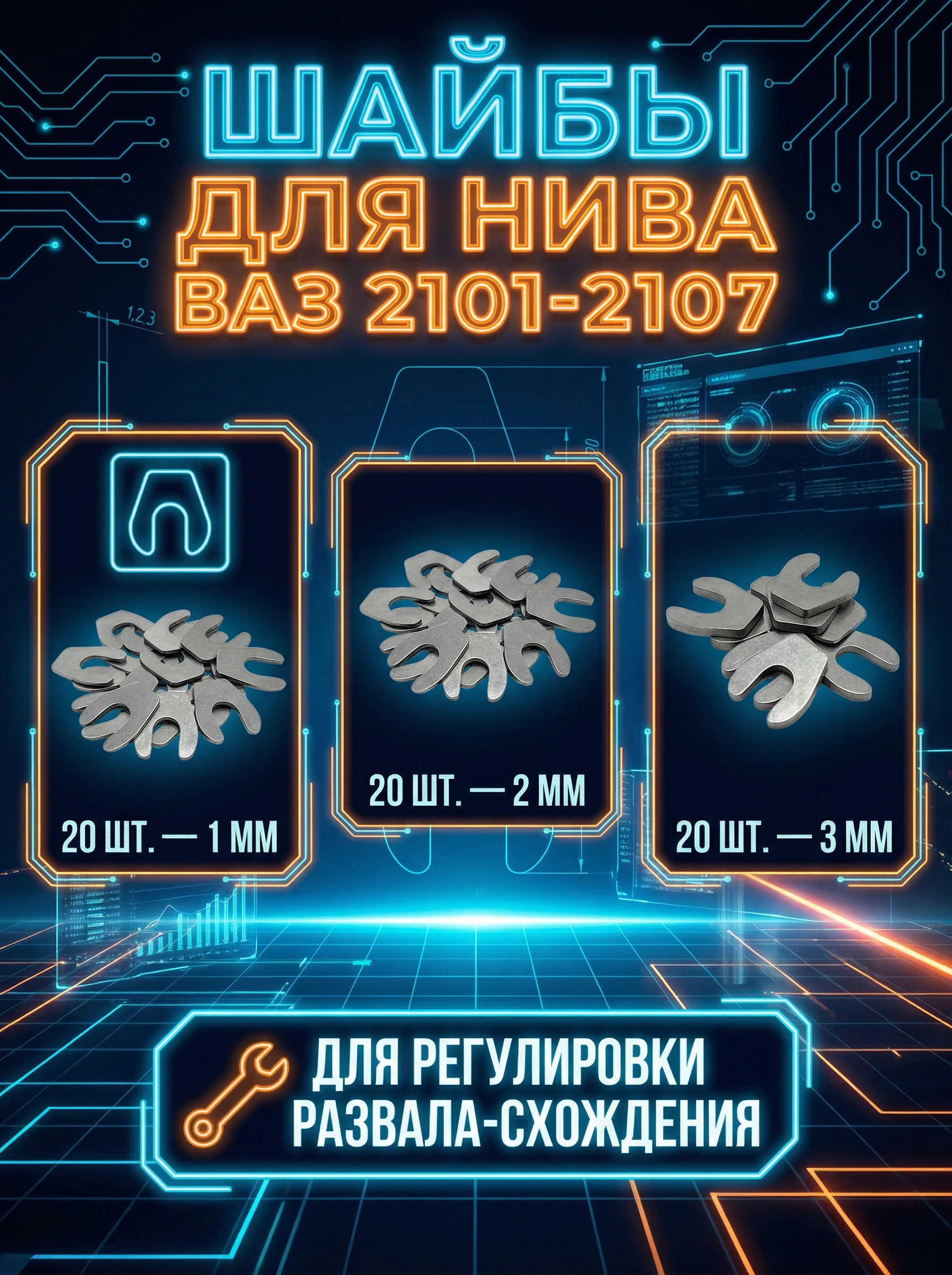 Создайте инфографику, в центре которой разместите три группы шайб (1 мм, 2 мм, 3 мм) с указанием количества (20 шт. в каждой). Используйте четкие иконки для каждой группы, обведите их рамками. В верхней части добавьте заголовок "Шайбы для НИВА ВАЗ 2101-2107", а внизу разместите текст о применении для регулировки развала-схождения. Используйте крупный, читаемый шрифт и цветовую гамму, соответствующую стилю автомобильной тематики.